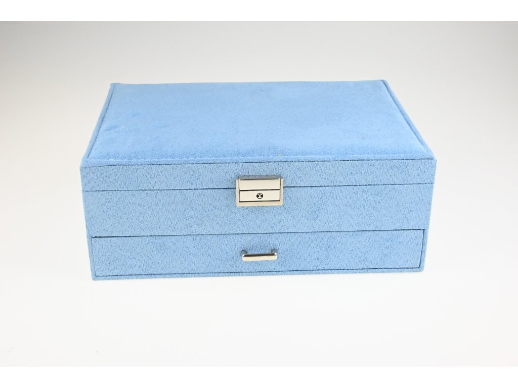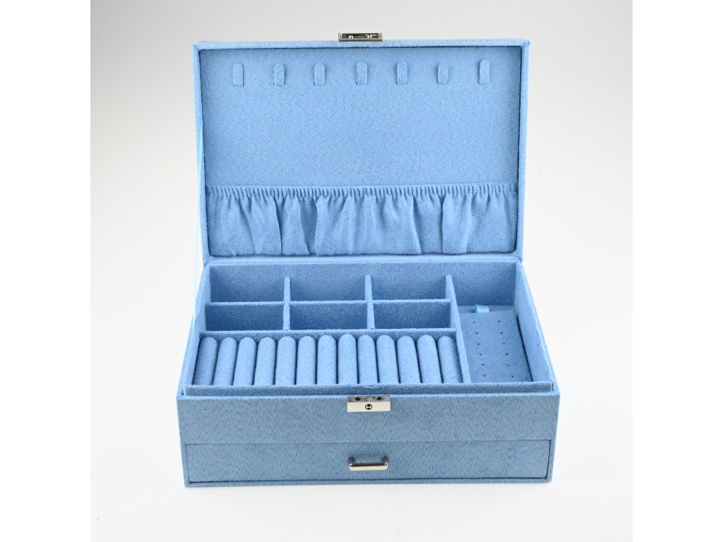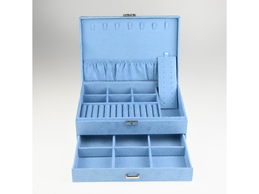 Šperkovnice nabízí dvě patra úložného prostoru. V horní části najdete speciální sekce pro prsteny a náušnice, zatímco spodní výsuvná zásuvka poskytuje další prostor pro náramky, náhrdelníky nebo hodinky. Promyšlené vnitřní uspořádání zajistí, že každý šperk bude dokonale organizován.