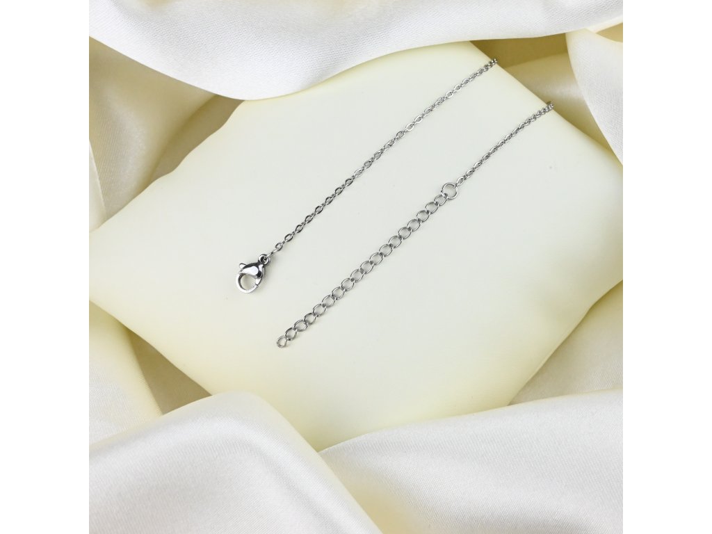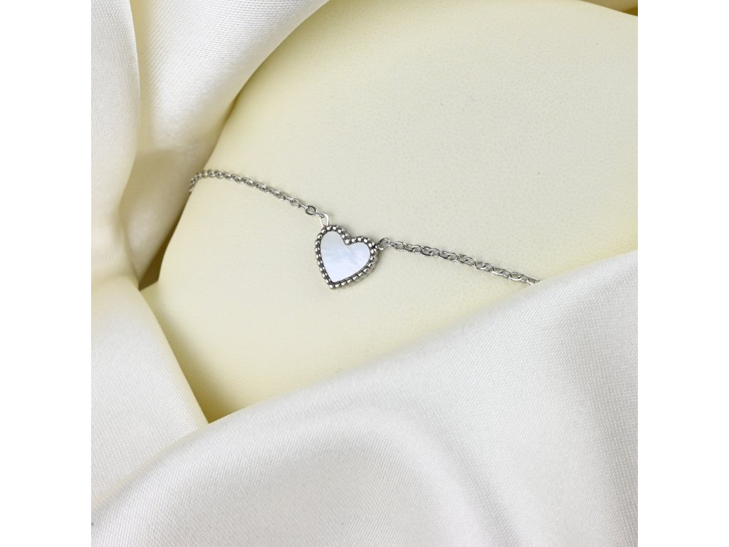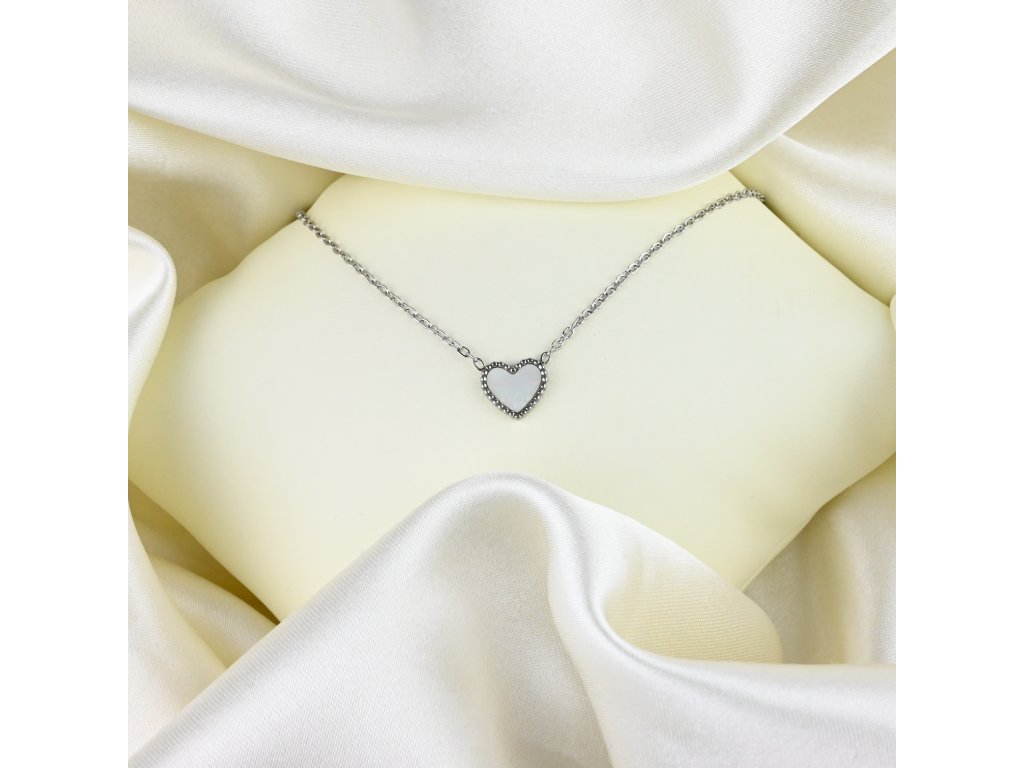 Náhrdelník má jemný řetízek, který je zakončen přívěskem ve tvaru srdce. Srdce je vyplněno perletí, což dodává šperku jemný a sofistikovaný vzhled. Délka náhrdelníku je nastavitelná v rozmezí 46–51 cm, což zajišťuje pohodlné nošení a univerzální využití.