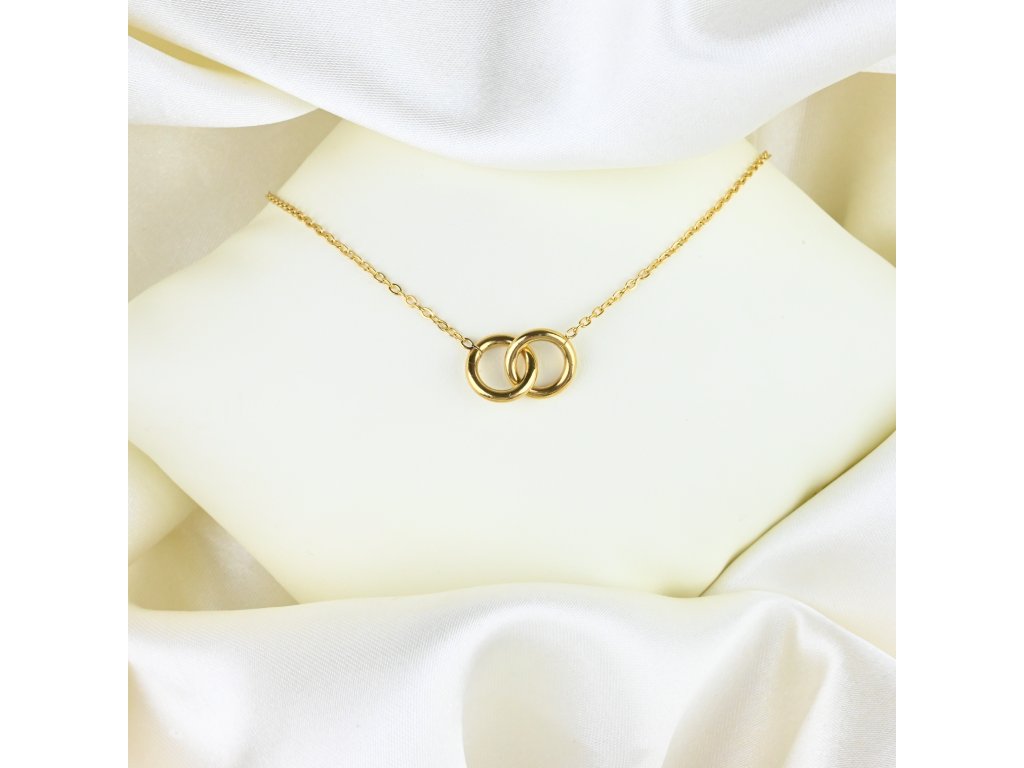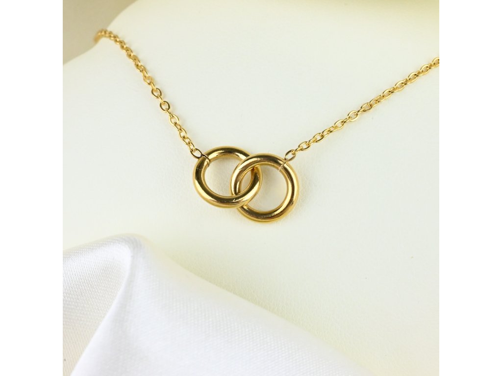 Pozlacený ocelový náhrdelník se spojenými kroužky nabízí minimalistický a zároveň výrazný design. Dva propojené kroužky z chirurgické oceli s lesklým pozlacením vytvářejí harmonický celek, který přitahuje pozornost a zároveň zůstává elegantní.