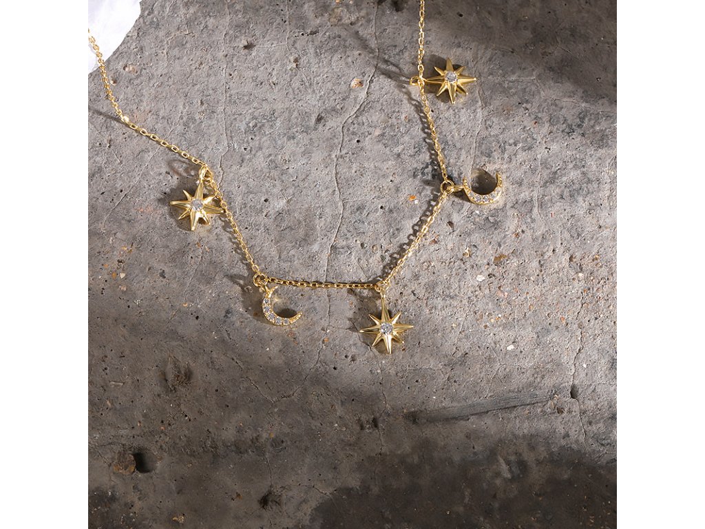 Dominantními prvky náhrdelníku jsou hvězdy a půlměsíce, které jsou rozmístěny podél jemného řetízku. Tento design evokuje kouzlo noční oblohy a dodává šperku romantický nádech.