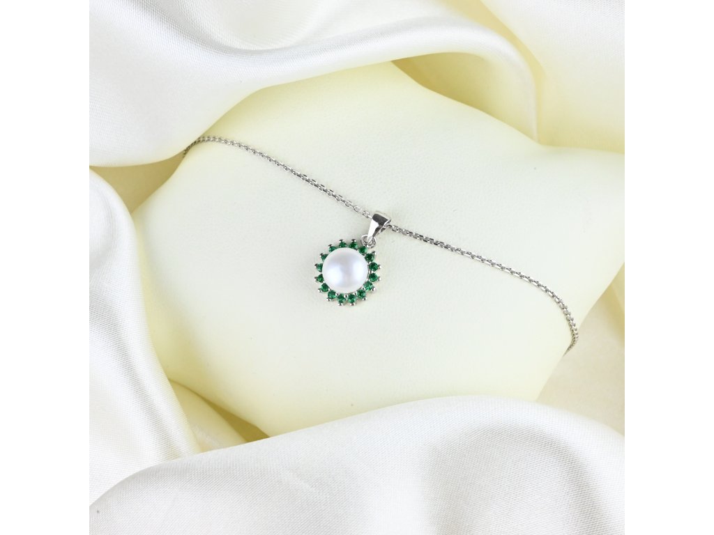Stříbrný náhrdelník s perlou a zelenými zirkony - Meucci SP110N