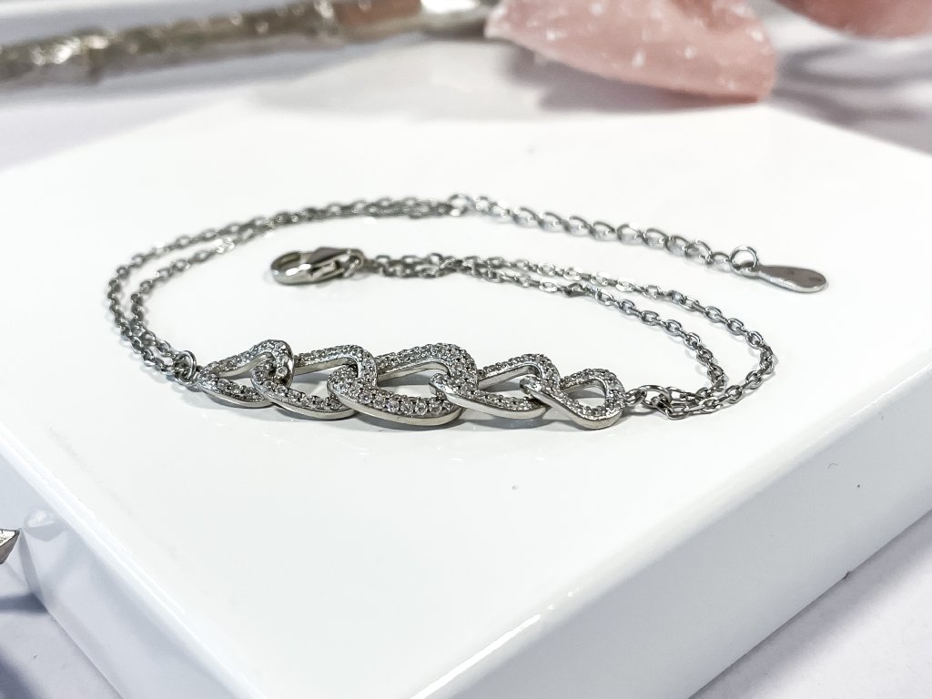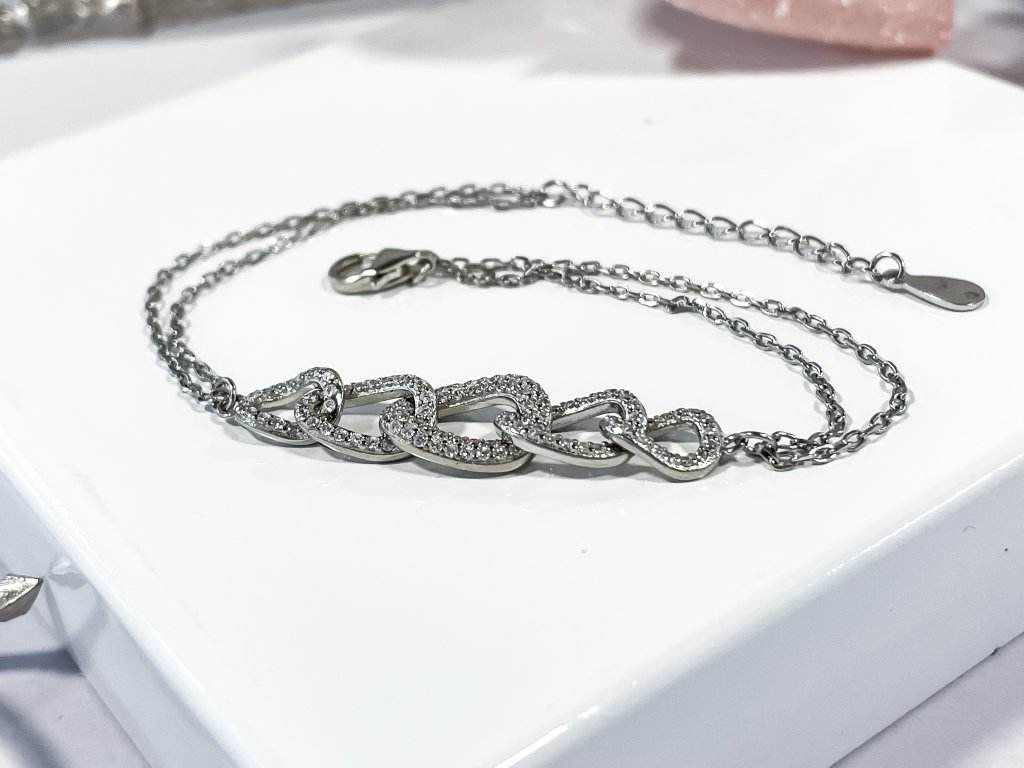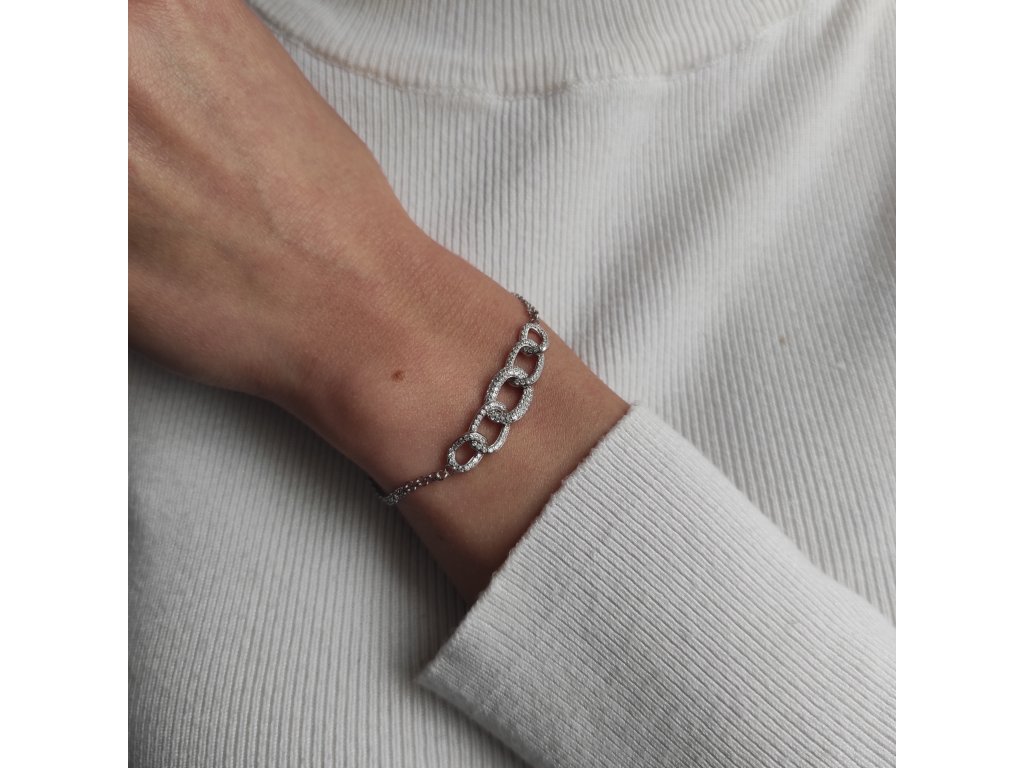Výjimečný design a sofistikovanost: Stříbrný náramek s propletenými oky představuje šperk, který zaujme svou unikátností a výjimečností. Jeho originální design je založen na pěti propletených stříbrných okách, z nichž prostřední je největší a krajní jsou nejmenší. Každé z ok je důkladně zdobeno drobnými čirými zirkony, které dodávají náramku jemný a oslnivý lesk.
