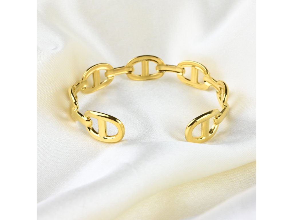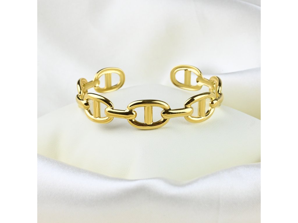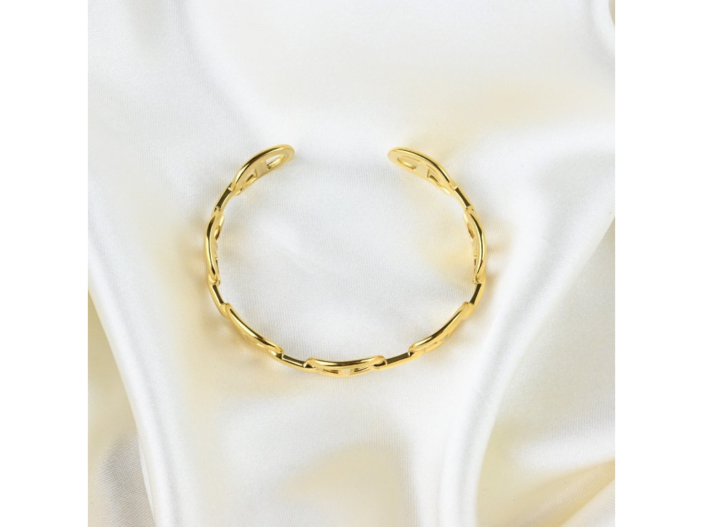 Tento pevný pozlacený ocelový náramek se spojenými ornamenty je ideální volbou pro večerní akce i pro elegantní denní outfity. Noste jej samostatně jako výrazný akcent nebo v kombinaci s dalšími jemnějšími náramky pro vrstvený, moderní vzhled.