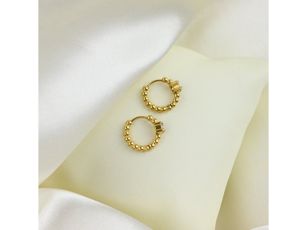 Tyto pozlacené ocelové kroužkové náušnice zaujmou čistým a originálním designem, který kombinuje klasický kruhový tvar s dekorativní strukturou drobných kuliček rozmístěných po celém obvodu. Tento detail dodává náušnicím jemnou texturu a moderní charakter, díky čemuž jsou snadno kombinovatelné s různými styly.
