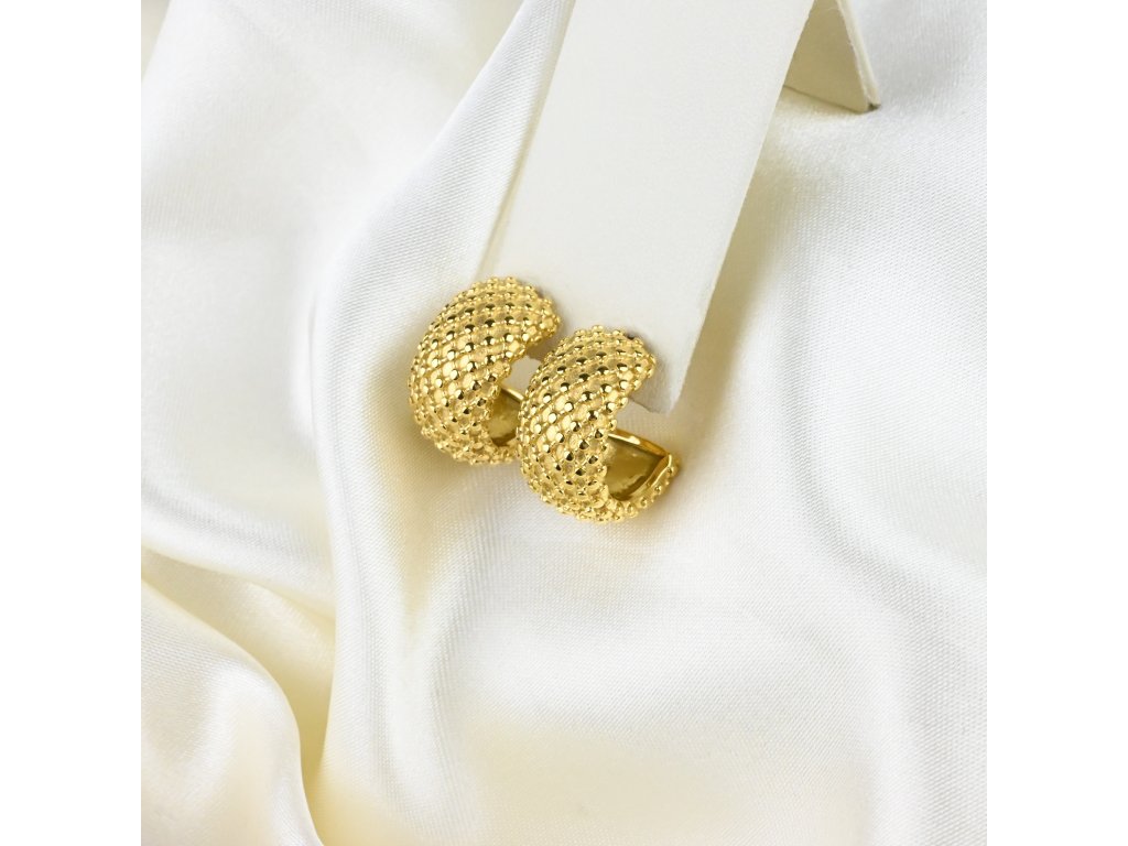 Odhalte sílu hran a měkkost oblouku — tyto náušnice v pozlaceném provedení z chirurgické oceli představují spojení minimalistické geometrie a ušlechtilého lesku. Půlkruhový tvar symbolizuje kontinuitu a otevřenost, jemná zlatavá úprava pak vyzdvihuje vaši osobnost s diskrétní grácií. Lesklý povrch přitahuje světlo a dodává výrazu vaší tváři jemné třpytivé akcenty.