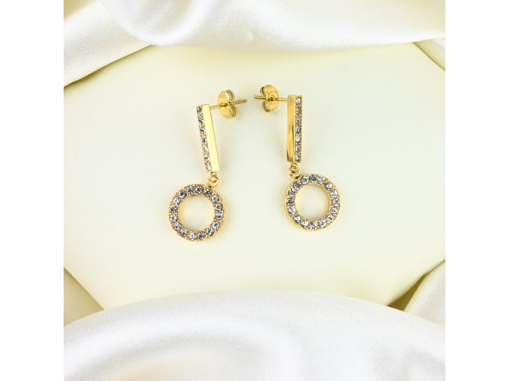 Tyto náušnice z kvalitní chirurgické oceli s pozlacenou úpravou představují spojení lesku, pohybu a precizních detailů. Visací tvar umožňuje šperku jemně se hýbat s každým krokem či gestem, čímž zachytává světlo a dodává tváři živý akcent. Zářivé čiré zirkony v sobě nesou symbol čistoty a elegance – šperk tak nepůsobí pouze jako doplněk, ale jako výrazný prvek vašeho vzhledu.