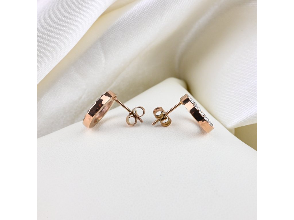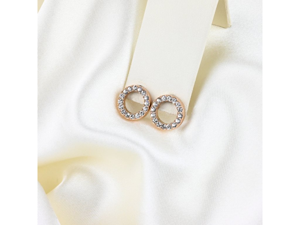 Tyto náušnice, vyrobené z odolné oceli a opatřené růžově pozlaceným povrchem, představují harmonii jemného odstínu a sofistikovaného zdobení. Kruhový tvar symbolizuje souvislost, rovnováhu a úplnost – jednoduchý, ale výrazný detail, který doplňuje osobnost nositelky. Lesklé pozlacené provedení v kombinaci s drobnými zirkony vytváří hru světla a třpytu, která přitahuje pohledy s nenucenou grácií.