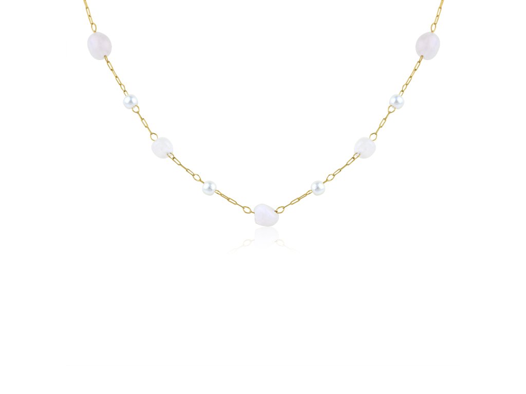 Pozlacený ocelový náhrdelník s růženíny a perličkami nabízí harmonii mezi jemnou elegancí a přirozenou krásou drahých kamenů. Jednotlivé růženínové kamínky, pečlivě vybírané pro svou jemnou růžovou barvu, symbolizují lásku, něhu a pozitivní energii, zatímco perličky přinášejí šperku jemný třpyt a sofistikovaný nádech.