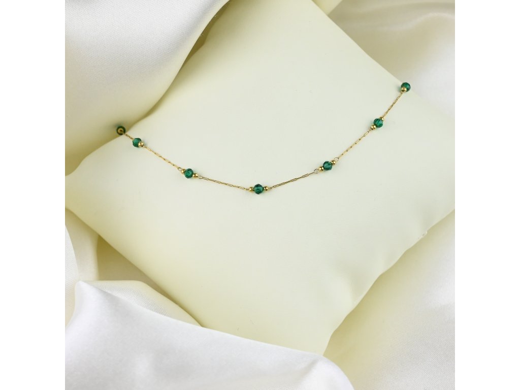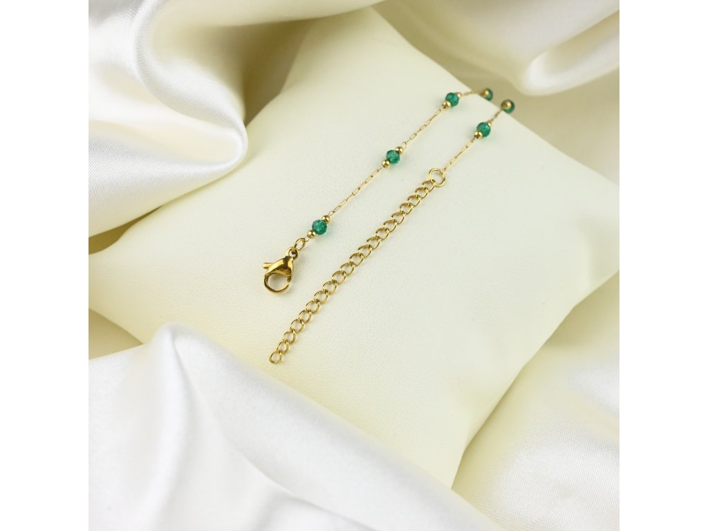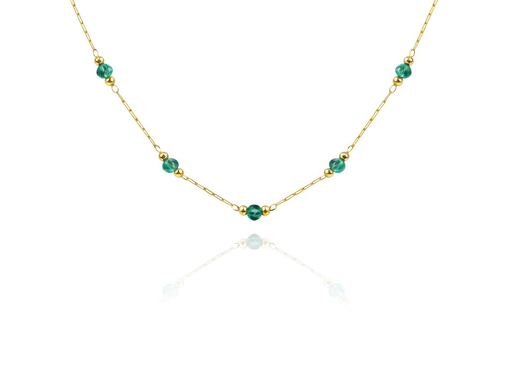 Pozlacená chirurgická ocel zajišťuje vysoký lesk a odolnost, takže náhrdelník zůstává krásný i při častém nošení. Jemný řetízek podtrhuje zelené korálky a vytváří harmonický a vyvážený celek.