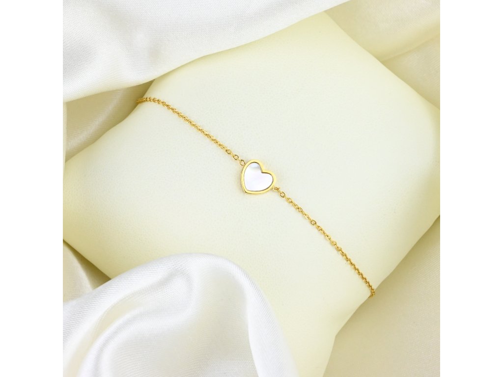 Tento pozlacený ocelový náramek spojuje nadčasový design s jemným a sofistikovaným detailem. Hlavní ozdobou je bílý lesklý přívěsek ve tvaru srdíčka, který symbolizuje něhu, lásku a pozitivní energii. Lesklý povrch srdce zachycuje světlo a vytváří jemný třpyt, který dodává náramku živý a elegantní vzhled.
