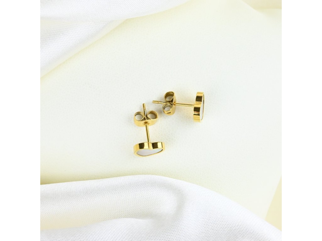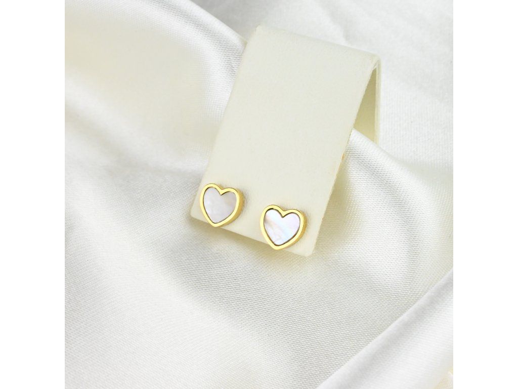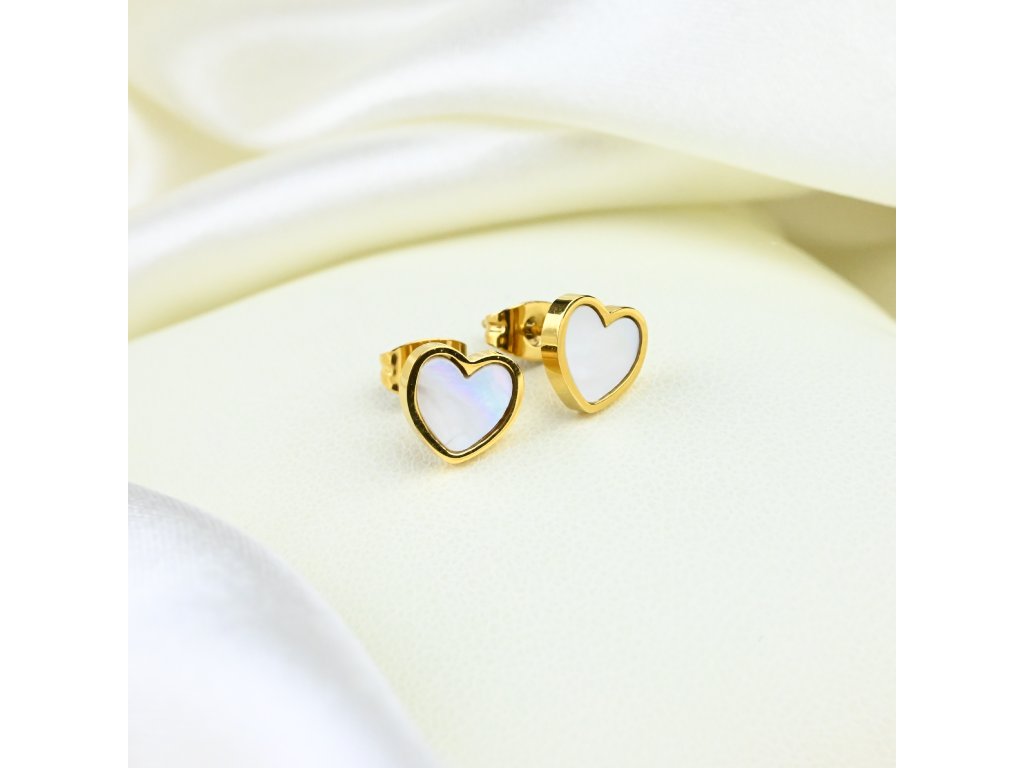 Tyto pozlacené ocelové náušnice spojují jemný design s nadčasovou elegancí. Hlavní ozdobou je bílý perleťový přívěsek ve tvaru srdíčka, který symbolizuje něhu, lásku a pozitivní energii. Lesklý povrch srdce zachycuje světlo a vytváří jemný třpyt, který dodává náušnicím sofistikovaný a přitom hravý vzhled.