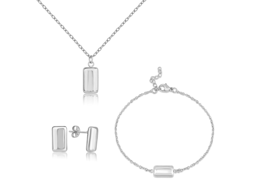 Tato sada náušnic, náhrdelníku a náramku z chirurgické oceli představuje dokonalou kombinaci moderního minimalistického designu a elegantního lesku. Dominantním prvkem je přesně tvarovaný obdélníkový motiv, který působí výrazně, ale zároveň čistě a vyváženě. Geometrické linie dodávají sadě současný charakter, aniž by působily přeplácaně.