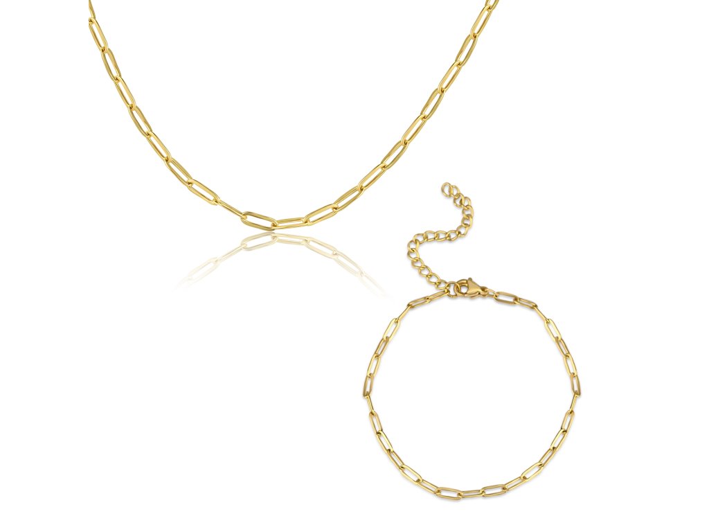 Tato pozlacená sada náhrdelníku a náramku se vyznačuje čistým, minimalistickým řetízkovým designem, který působí elegantně a nadčasově. Jemný lesk oceli dodává šperkům sofistikovanost, zatímco precizní zpracování a kvalitní materiál zaručují odolnost a dlouhotrvající lesk.