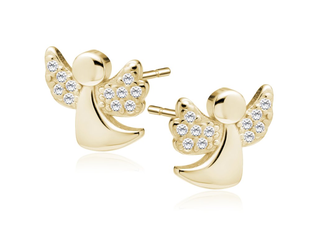 Tyto pozlacené stříbrné náušnice ve tvaru andílků představují spojení něžného designu a jemného třpytu. Motiv anděla symbolizuje ochranu, lásku a naději, díky čemuž má šperk nejen estetickou, ale i osobní hodnotu. Křídla andílka doplňují precizně zasazené čiré zirkony, které zachycují světlo a dodávají náušnicím elegantní jiskru.