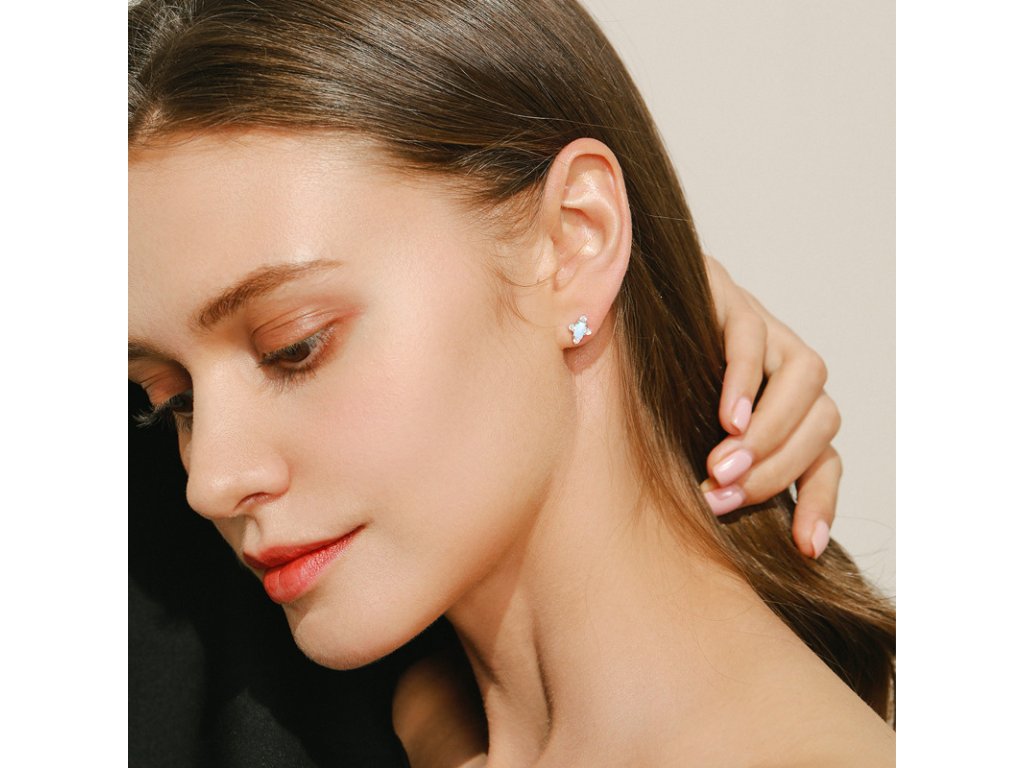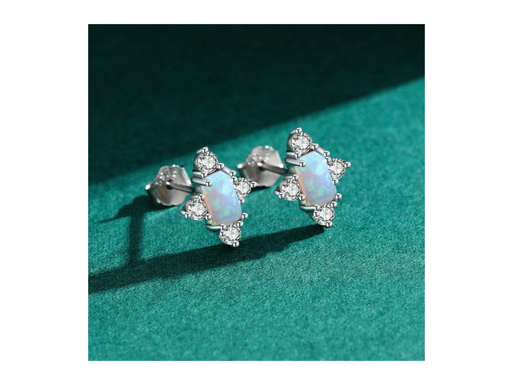 Doplňkem opálu jsou čtyři drobné čiré zirkony, které náušnicím přidávají zajímavý detail a jemnou dynamiku. Zirkony jsou pečlivě vybrány a precizně zasazeny, aby zvýraznily krásu opálu, aniž by ji zastínily. Tento kontrast mezi klidnou jemností opálu a třpytivým leskem zirkonů vytváří harmonický a vyvážený šperk, který zaujme i nejnáročnější oči.