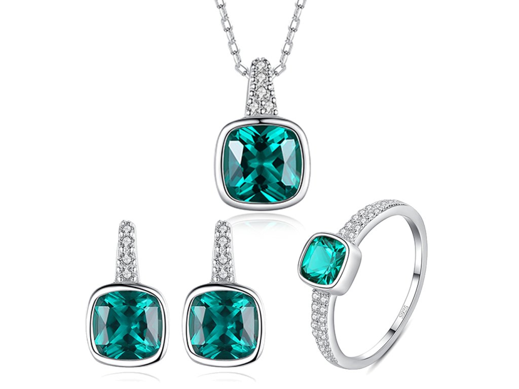 Nad dominantním zeleným kamenem se nachází několik čirých zirkonů, které náušnicím dodávají jemnou jiskru a zajímavý kontrast. Tato kompozice vytváří efektní vizuální dynamiku a přitahuje pohledy, aniž by byla přehnaná, a zároveň nechává vyniknout přirozenou krásu zeleného čtverce.