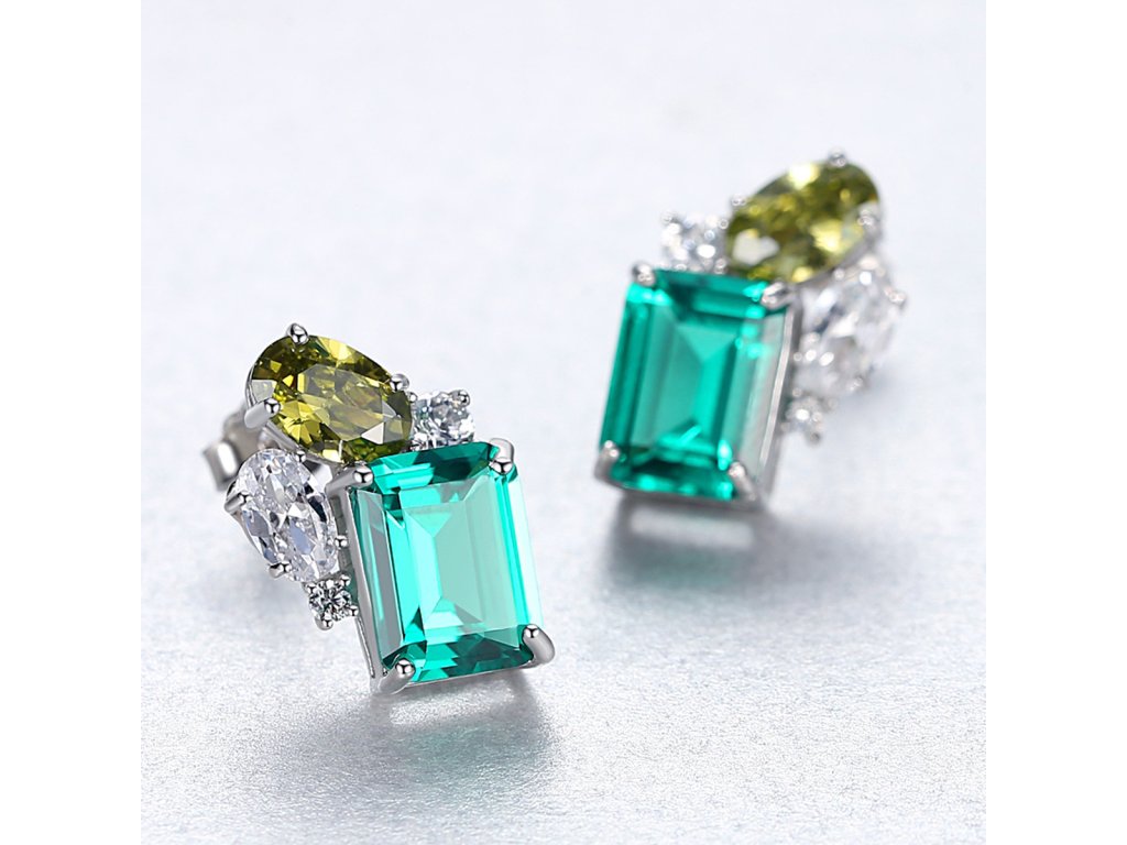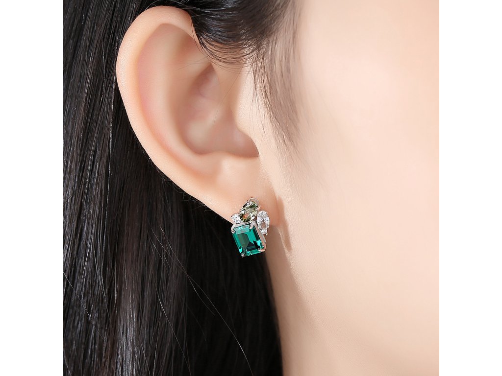 Okolo dominantního zeleného kamene jsou nerovnoměrně rozmístěné čiré zirkony, které vytvářejí hravý, asymetrický efekt. Tento neotřelý design dodává náušnicím dynamiku a zajímavou vizuální hloubku, která se mění s každým pohybem. Kromě čirých kamenů se na straně objevuje olivově zelený zirkon, jenž jemně doplňuje hlavní kámen a zvyšuje celkový kontrast a působivost šperku.