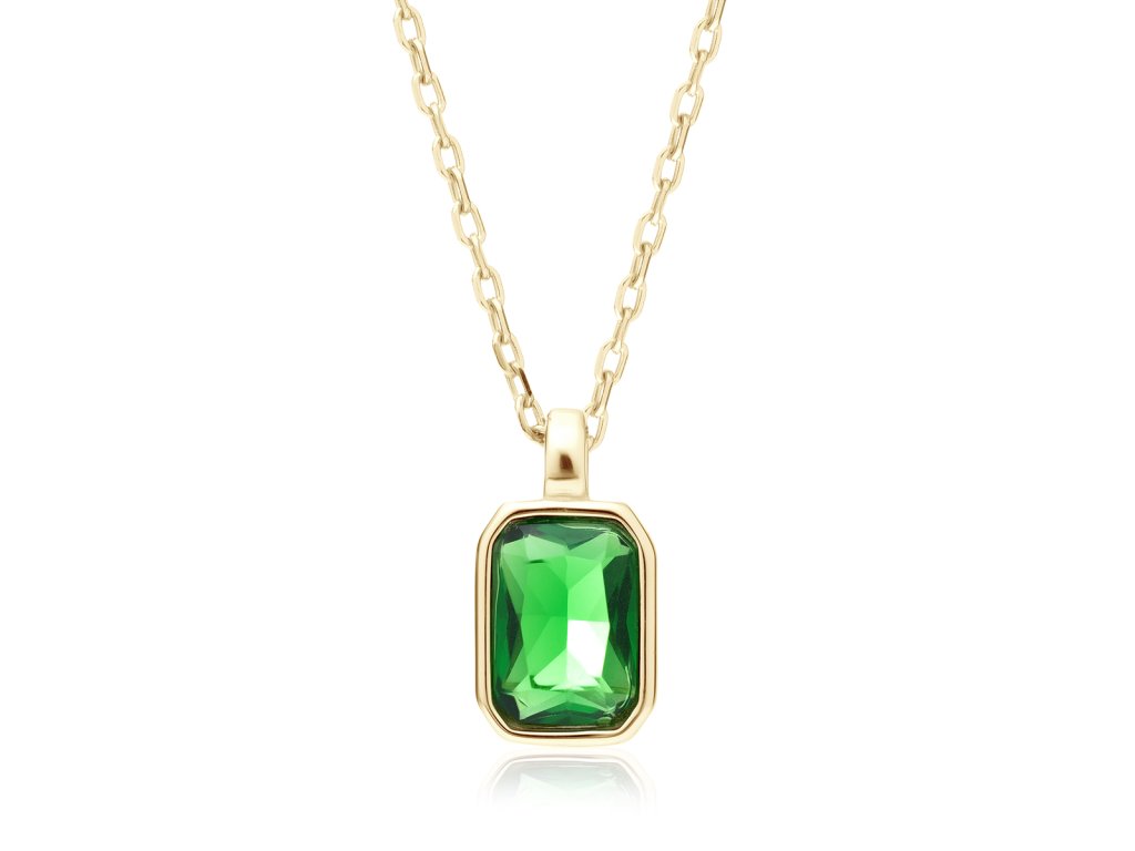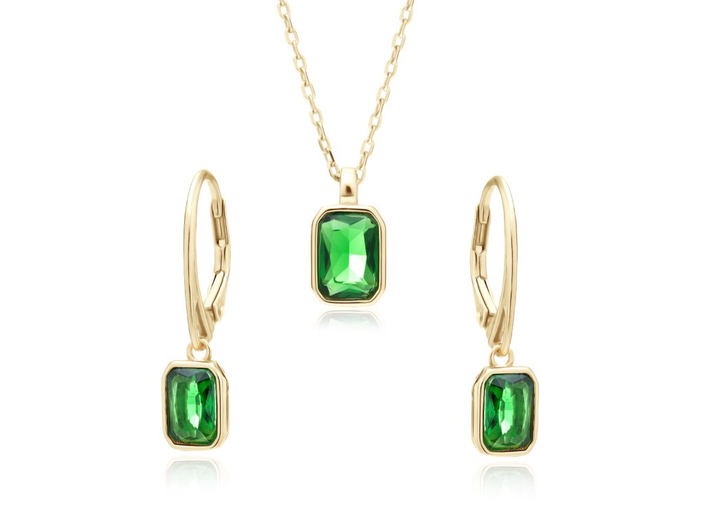 Náušnice i přívěsek náhrdelníku jsou zdobeny zelenými zirkony, které šperku dodávají výrazný a zároveň jemný vzhled. Lesklé zlacení vytváří sofistikovaný kontrast a podtrhuje luxusní charakter sady.