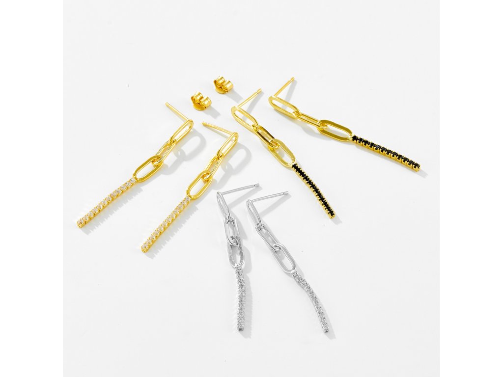 Geometrická elegance a moderní styl: Tyto dlouhé visací náušnice jsou esencí současného šperkařství. Kombinují minimalistický řetězový design s oslnivým leskem čirých kamenů, čímž vytváří výrazný a sofistikovaný doplněk.