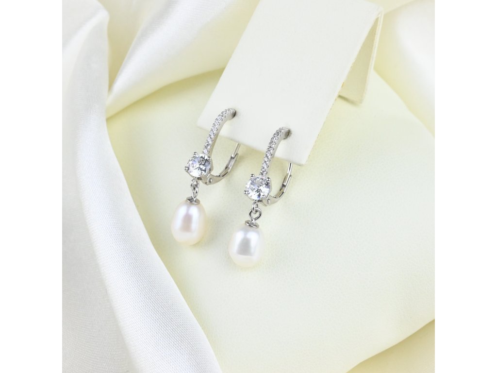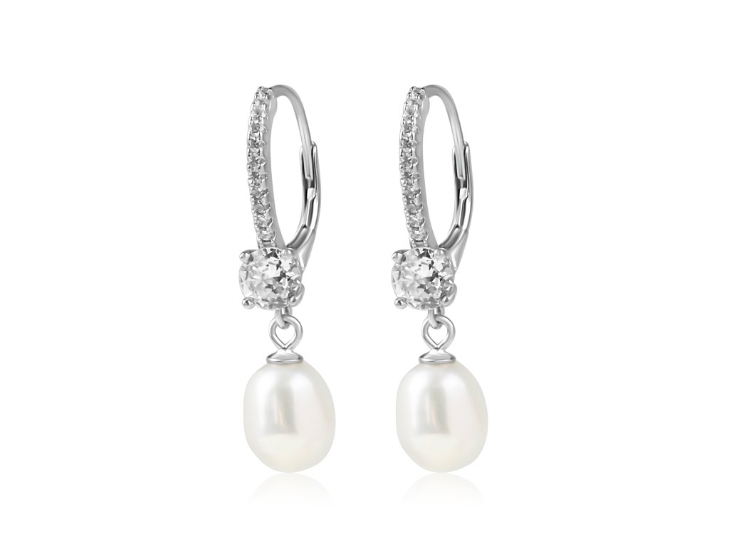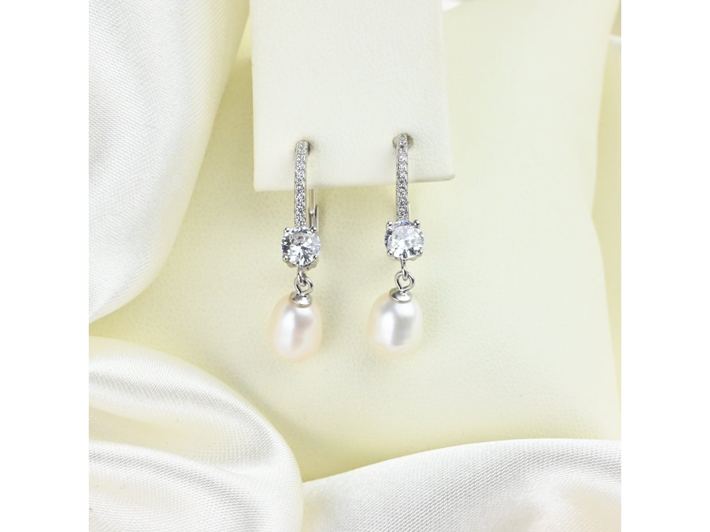 Stříbrné visací náušnice s říční perlou a zirkony - Meucci SP116E